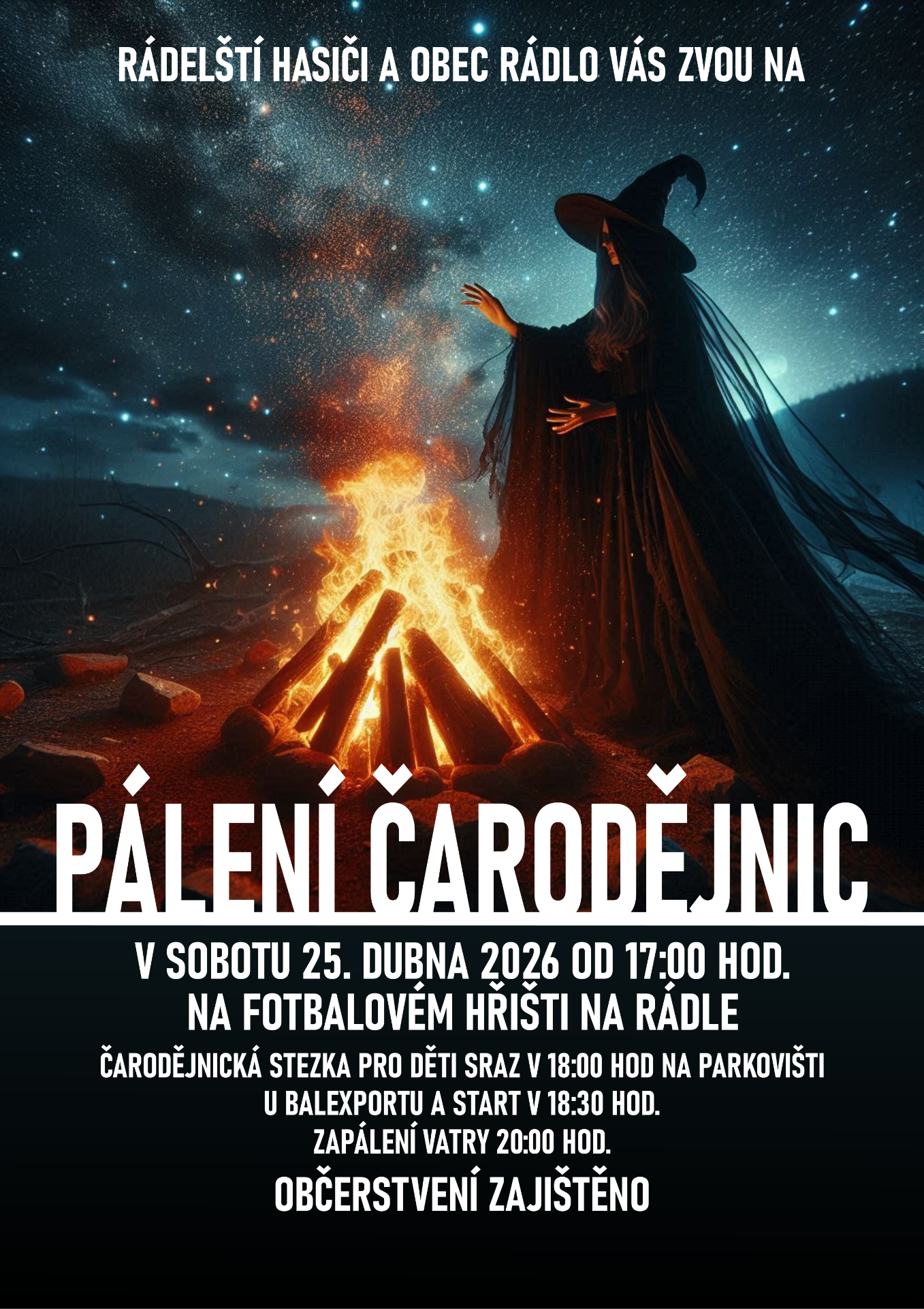 Rádelský sbor dobrovolných hasičů a Obec Rádlo srdečně zvou všechny na Pálení čarodějnic v předtermínu, které se uskuteční v sobotu 25. dubna 2026 od 17:00 hodin na fotbalovém hřišti v Rádle.
